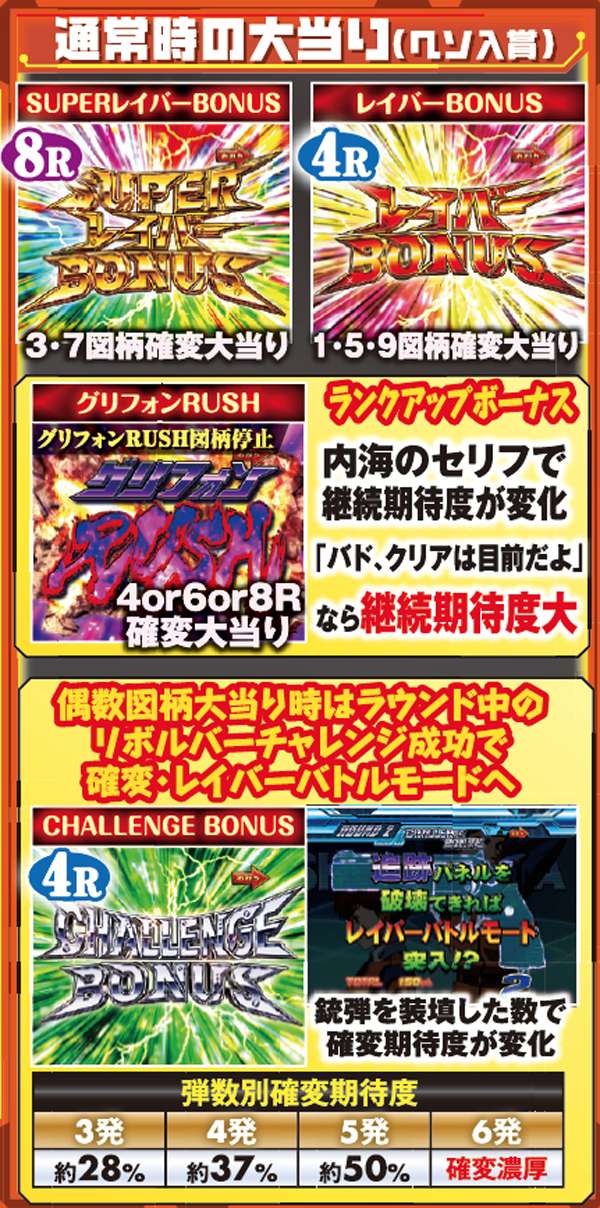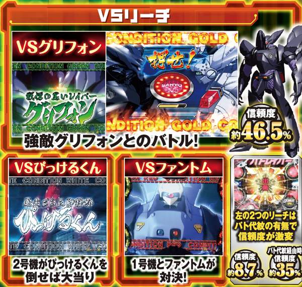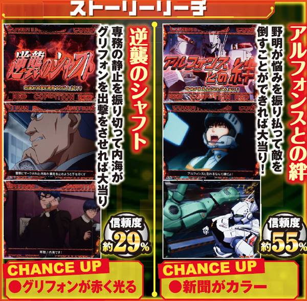 シャフト図柄停止や弱系リーチハズレ後から発展する可能性がある。信頼度は約20%と高くはないが、成功すればグリフォンRUSHor3・7大当りが約束される。