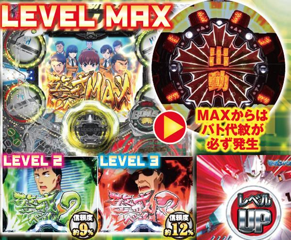 通常時のメイン演出であり疑似連の役割を担うのが、この警戒レベル。一気に上位レベルにアップすることもあり、疑似連と言っても重要なのは回数ではなく到達したレベル。信頼度約50%&必ずパト代紋ギミックが完成する「MAX」へ到達するかが初当りのカギを握る。