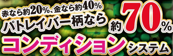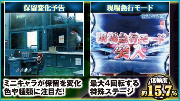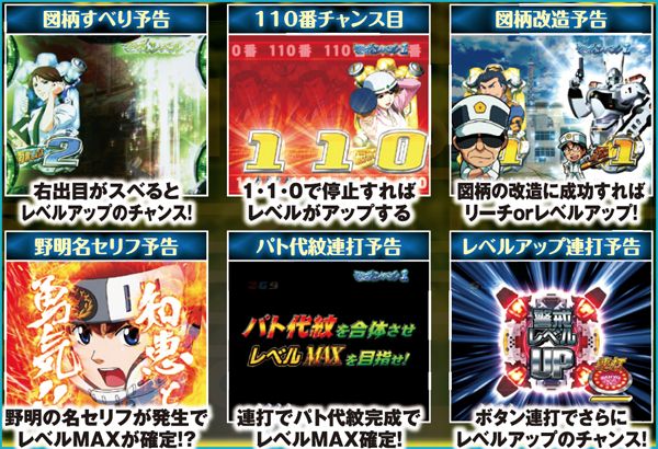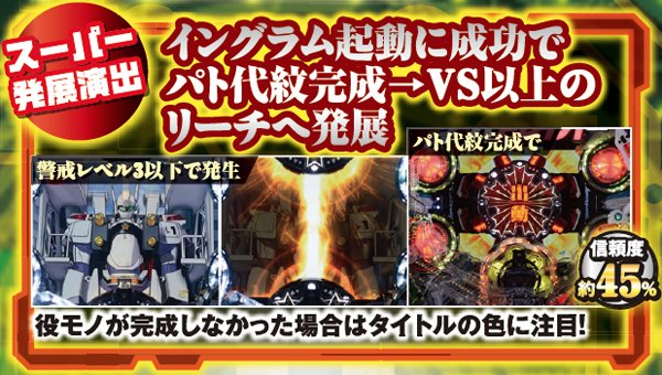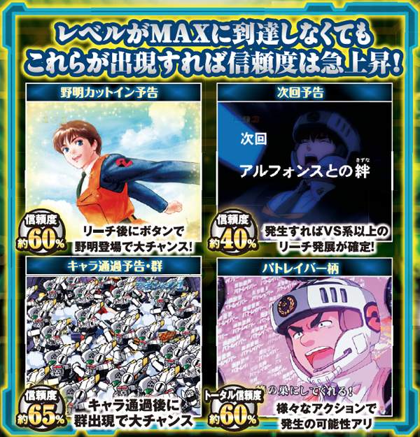 通常時を彩る演出は数多いが、共通して重要なのは色変化で、とりわけ「金」以上の発生に注目。概ねどんな予告でも、赤=約10%・金=約30%・パトレイバー柄=約60%と覚えておこう。