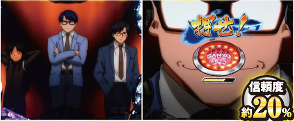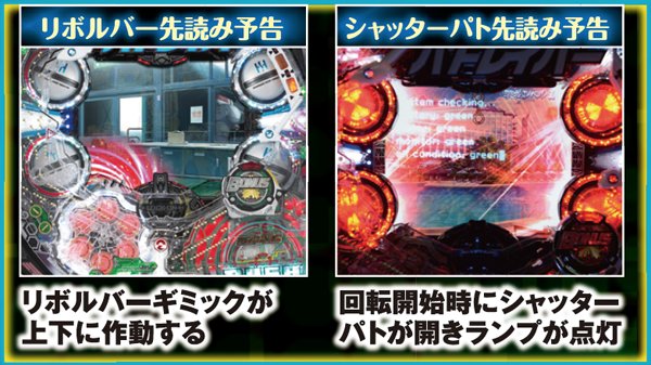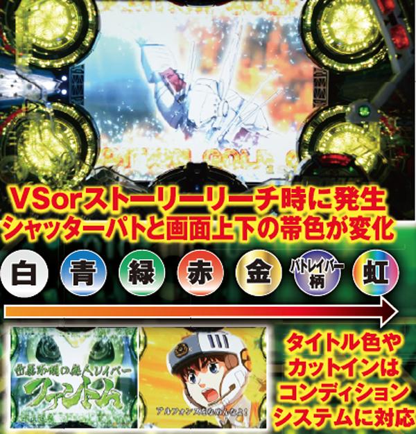 リーチ中は画面上下の帯とシャッターパトの色により期待度が激変し、タイトル色がそのまま開始色に、そして最終ボタン発生時のコンディションがカットイン色に対応している。カットイン発生後も変化する可能性を秘めており、リーチ終盤まで気が抜けないぞ。