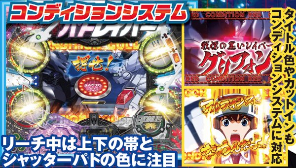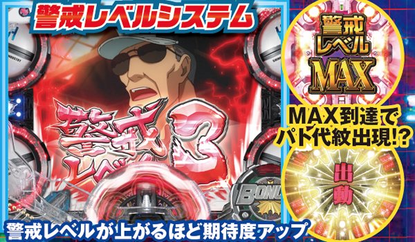 「警戒レベル」は回転中の液晶上に表示されるチャンスアクションで全4段階。レベルは回転中からリーチ後など多種多様なタイミングで上昇する可能性があり、MAXまで到達すれば必ずド迫力のパト代紋役モノが作動し、大チャンスとなる。「コンディションシステム」はシャッターパト役モノの色で期待度を示唆するリーチ中の最注目ポイント。