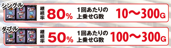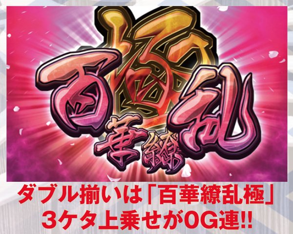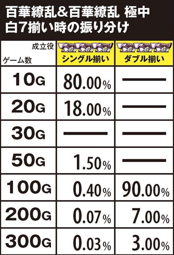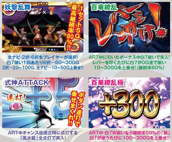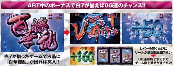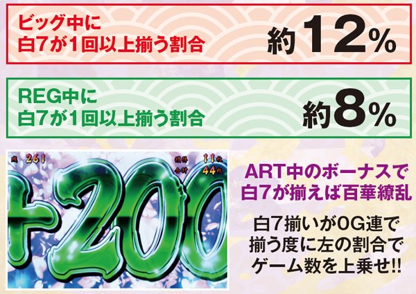 ART中(準備中を除く)のボーナス消化中に白7を揃えると0G連の大チャンス。百華繚乱は継続率80%なので細かい上乗せが多発、ダブル揃いの百華繚乱極なら3ケタ上乗せが50%で継続するのでどちらも強力な特化ゾーンだ。