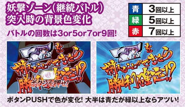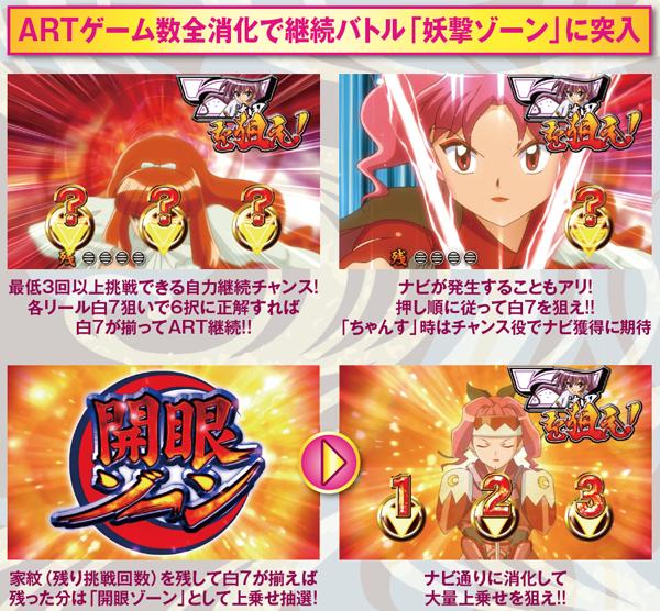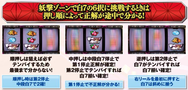 ARTを消化すると必ず移行するのが、ラストバトル「妖撃ゾーン」。ここで白7揃いを達成できれば次セットに継続で、白7揃いのチャンスは最低でも3回以上となる。基本は6択の押し順チャレンジだが、レア役の成立で2択、全ナビなどの「ナビ」を獲得できることも…。
