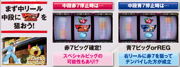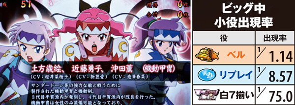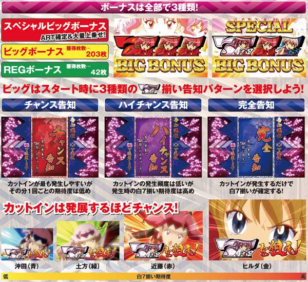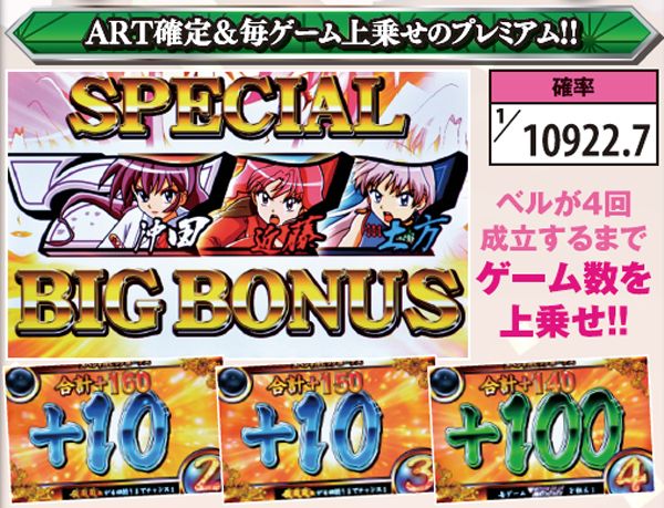 沖田、近藤、土方の3人が揃うスペシャルビッグ(白7・赤7・青7)は、ベルが4回揃うまで継続する特殊なビッグ。獲得枚数は控え目だが、白7確率が飛躍的にアップしており、白7が揃うたびにゲーム数の上乗せが繰り返される。通常時のみならず、ART中も揃う可能性あり。