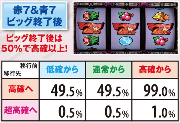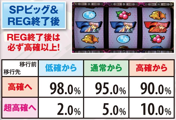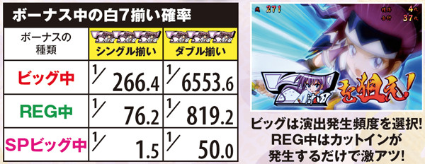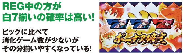 ボーナス中の白7揃い確率はビッグ中よりREG中の方が高いが、消化ゲーム数が多いため1回のボーナスで白7が揃う割合はビッグの方が上。