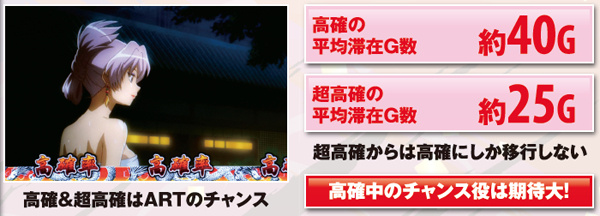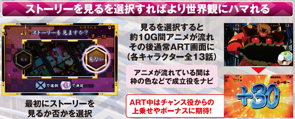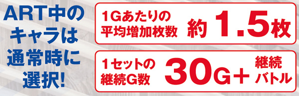 ARTは純増1.5枚の30G1セット。ゲーム数上乗せも特化ゾーンもあり、もちろんボーナスも普通に抽選しているが、継続については自力抽選と一風変わった仕様だ。