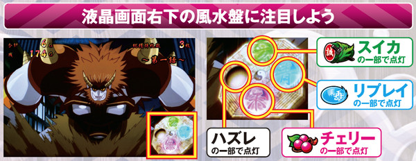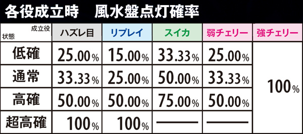 風水盤はそれぞれ対応役成立時に点灯抽選が行われており、状態によっても確率は上下する。点灯する際は巨大な敵が出現する演出が発生しやすいため、まだ点灯していない色の敵が現れたらチャンスだ。