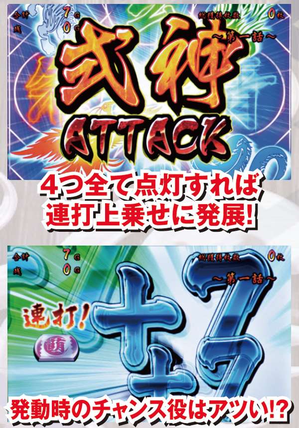 ARTに突入すると出現する右下の風水盤で、4つ全て点灯させると式神アタックが発動。第3停止後にボタンを連打するとゲーム数が次々に上乗せされるぞ。
