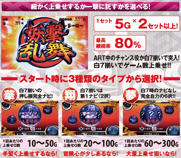 「妖撃乱舞」はプレイヤーが押し順当ての難度を選択。全ナビの「華」を選択すればナビに従うだけで10~50Gの上乗せだが、「翔」は2択成功で20~100G、「夢」なら6択成功で60~300Gゲットとなる。「百華繚乱」は、継続率80%で白7が揃いまくる0G連だ。