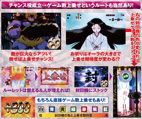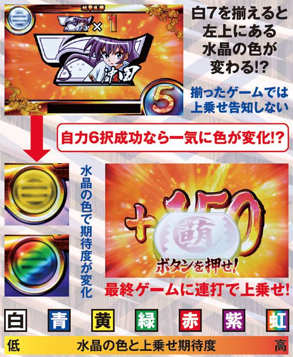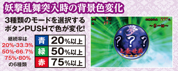 特化ゾーンの中でも最も興奮度が高いのが妖撃乱舞。上乗せタイプを3種類から選択できるので手堅くいくのも大物狙いも自由自在だ。上乗せゲーム数は白7を揃えた時ではなく、最後にまとめて告知されるので、水晶に注目しておこう。