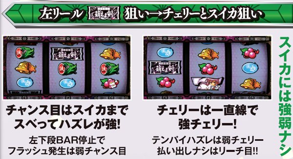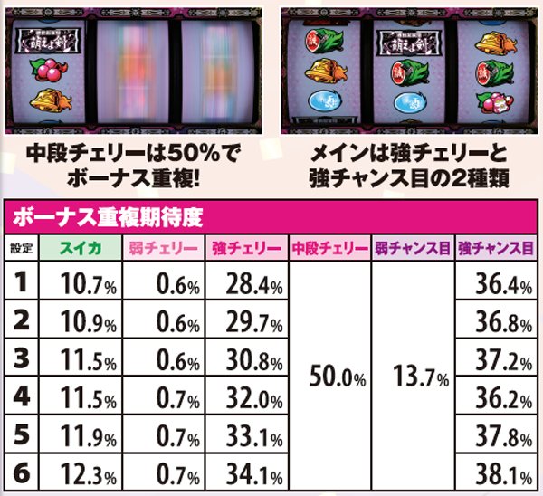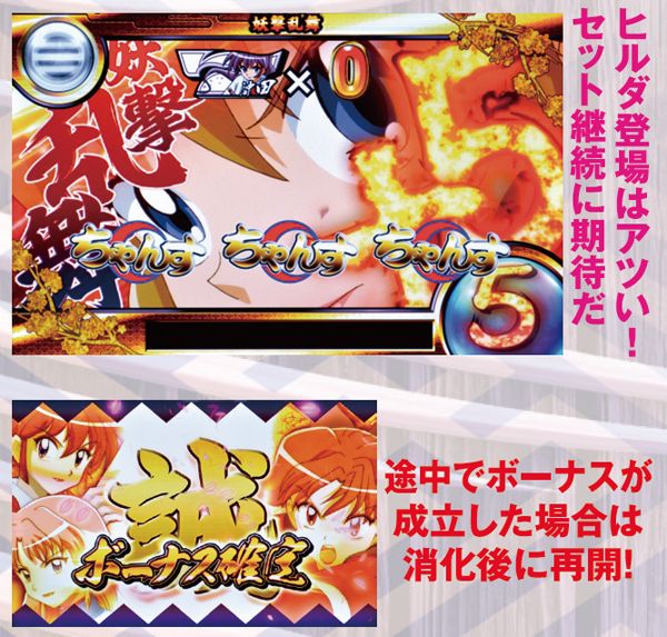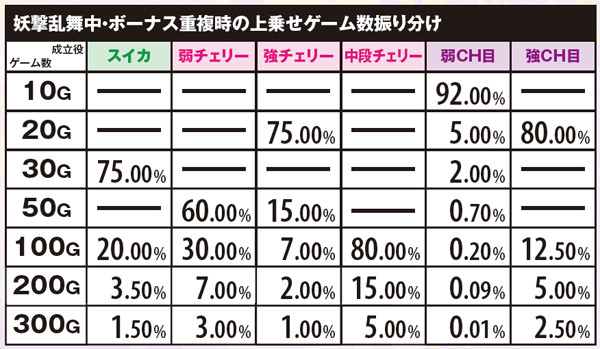 選択型上乗せ特化ゾーンの妖撃乱舞は強チェリーからの突入がメイン。スイカからの突入率には設定差があり、低設定では中々当選しないため複数回突入を確認できたら高設定に期待してもいいだろう。