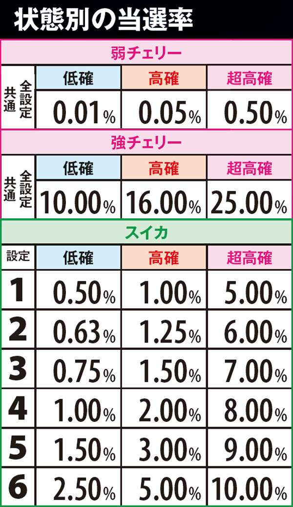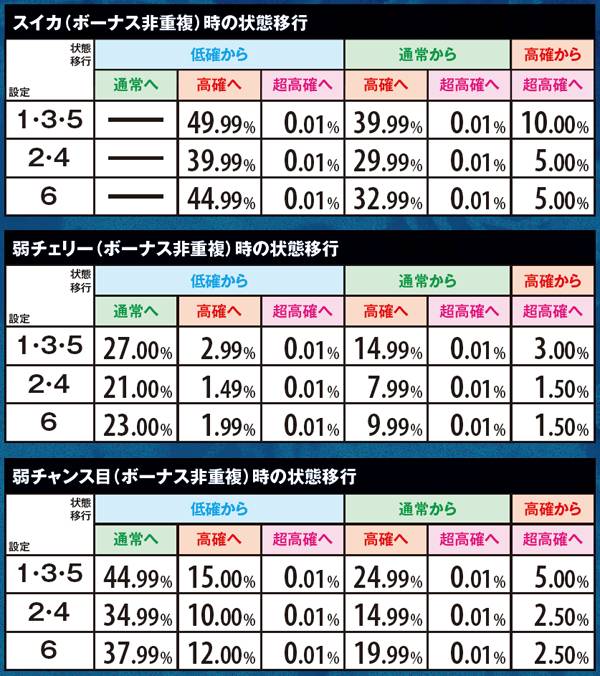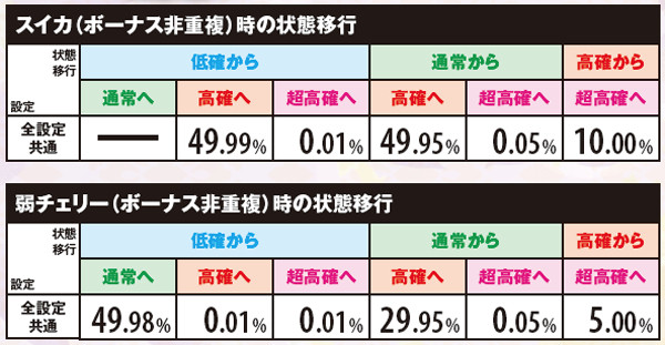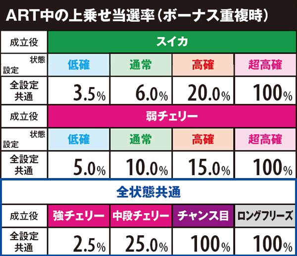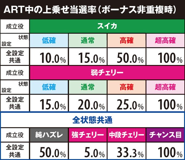 ART中の上乗せ当選率は弱系チャンス役だと状態による影響が大きく、高確以上なら期待大、対してチャンス目は状態もボーナス重複も問わず上乗せ確定だ。ちなみに、純ハズレの確率は16384分の1で、見た目のハズレとは異なる。
