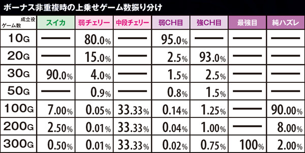ART中のゲーム数上乗せは1回につき最大300Gで、出現=上乗せ確定のチャンス目は一気に大きなゲーム数を上乗せすることは少なめ。設定差があるのは強チェリー時のみだ。
