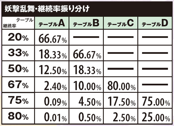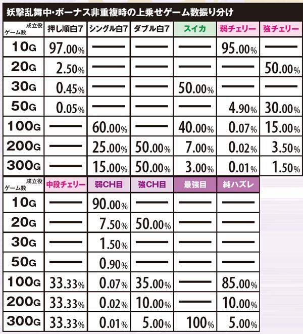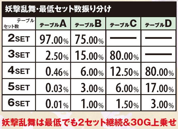 妖撃乱舞のセット数&継続率は4種類のテーブルA~Dによって定まる。ABなら2セットで終わりやすいので、3セット以上継続したら高継続率に期待できそうだ。表の押し順白7の上乗せゲーム数は華(全ナビ時)のものだ。