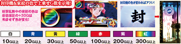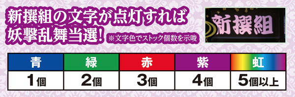 封印機や家紋の色は全部で7種類あり、赤以上になれば3ケタ上乗せ確定となる。封印機の上にある新撰組の文字はART準備中やストーリー中、継続バトル中の妖撃乱舞当選で点灯する。