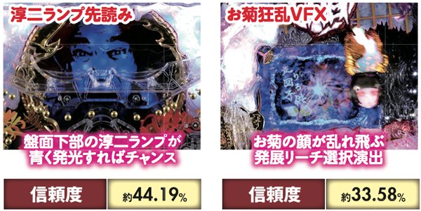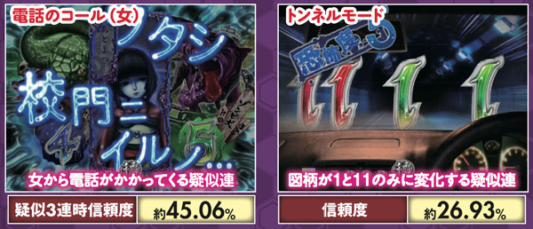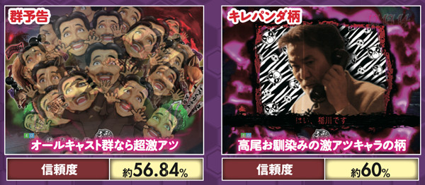 怖ろしくも多彩な予告からも目が離せない。4大演出はもちろんのこと、定番の群やキレパンダ柄にも注目だ。ともに信頼度50%オーバーを誇る、最恐レベルの予告となっている。