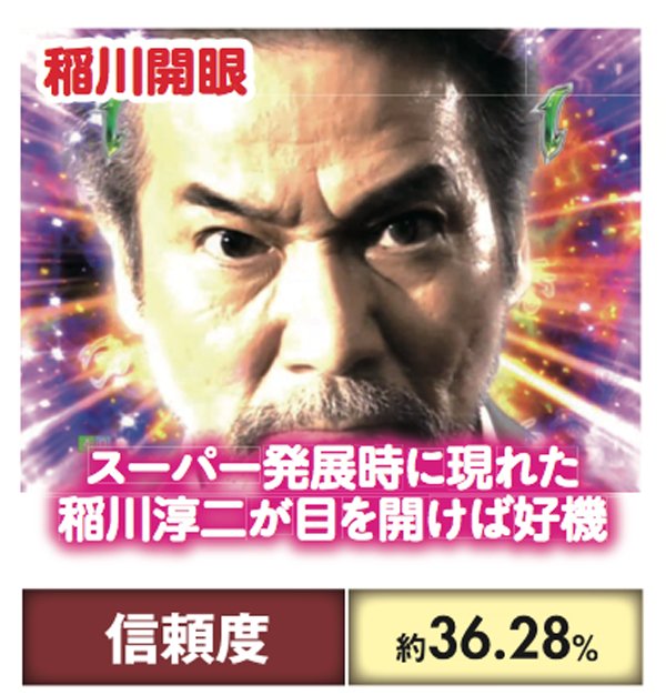 恐怖のストーリーテラー・稲川淳二の世界へようこそ。 確変突入率96%のST機でも、唯一無二の怪談の語りは続いていく…。 |