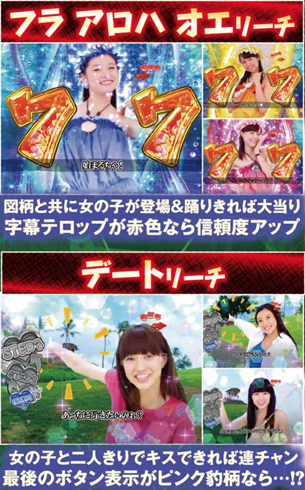 水着満載…常夏の雰囲気をたっぷり味わえるマシンが登場! 本機最高位の電サポモード・ティキ島バケーションは100回転or次回当りまで継続。この連チャン期待度は約77%を誇り、ひいらぎ(とっきー)・うらら(逢沢りな)・かえで(小池里奈)の3人から選択したキャラが中心となるアクションが堪能できるのだ。 |