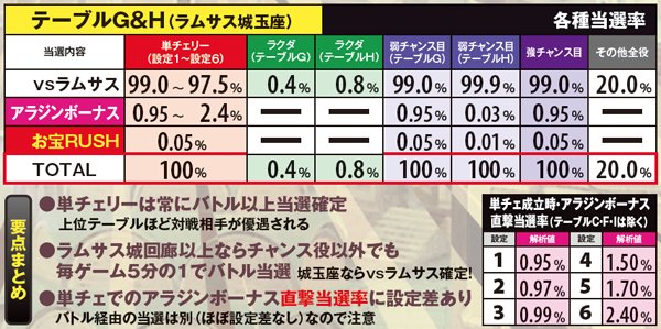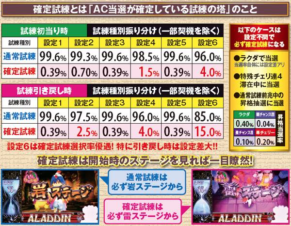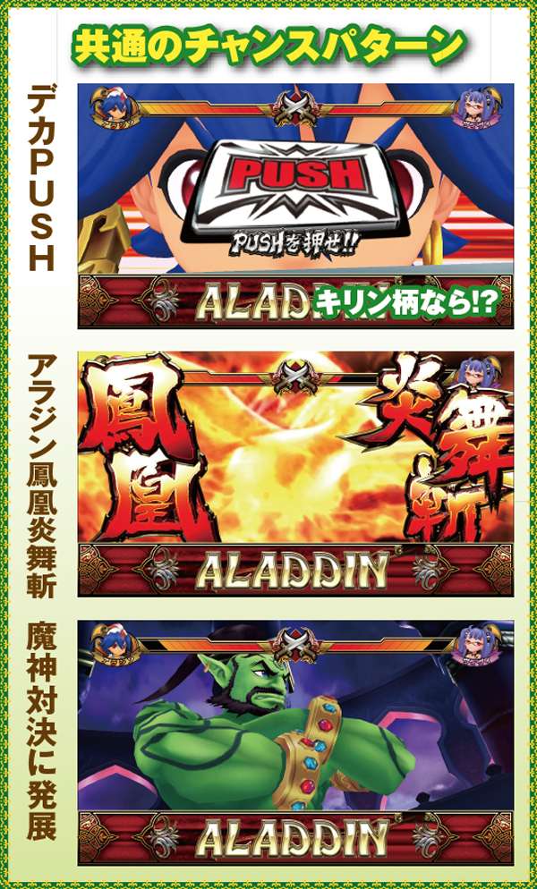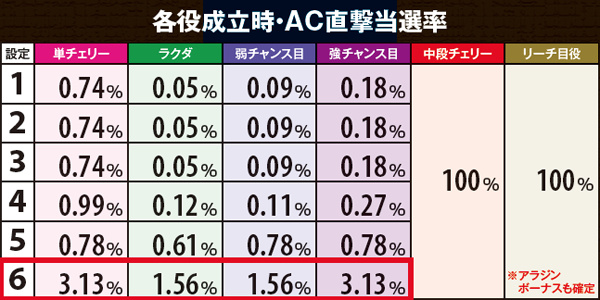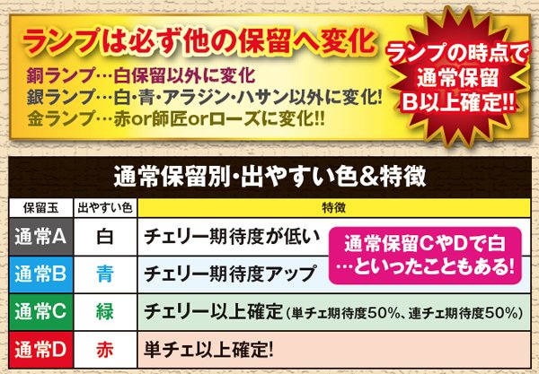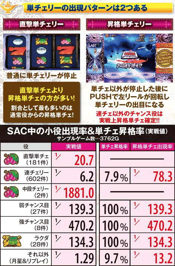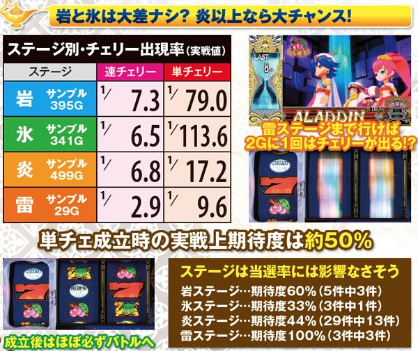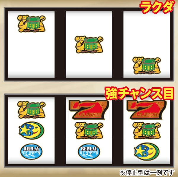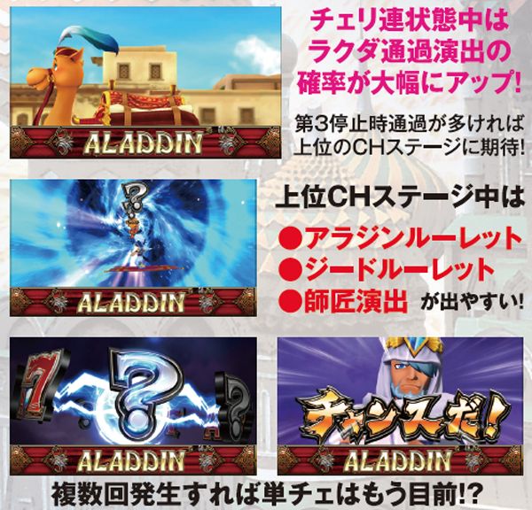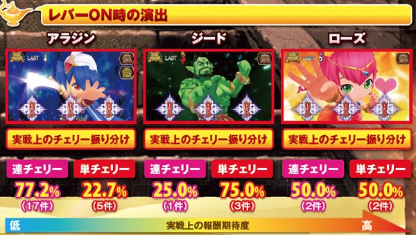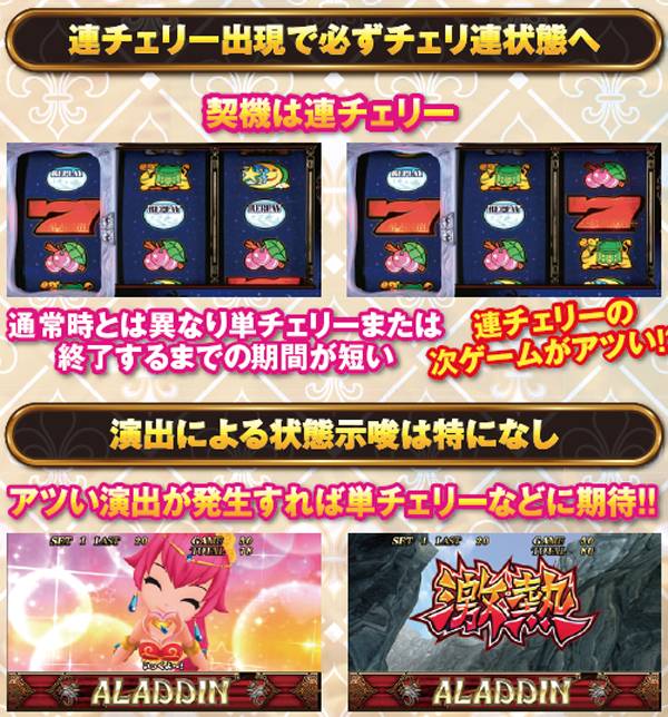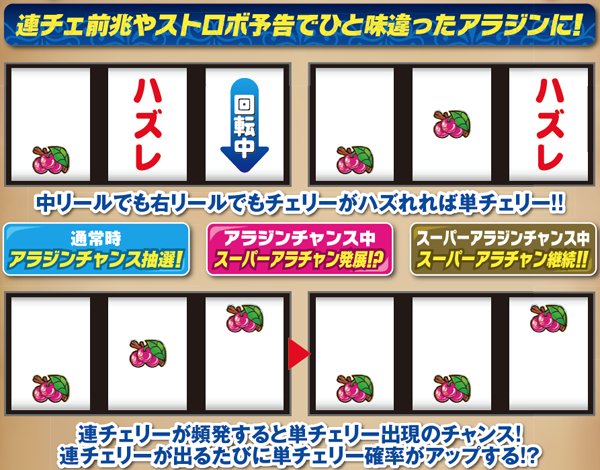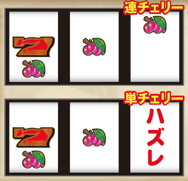 連チェリー&単チェリー成立時は、チェリーを狙うと必ず下段にチェリーが停止。アラジンチャンス絵柄を狙った際は、上段にアラジンチャンス絵柄の下側が停止する。また、中段チェリー成立時は、狙う場所を問わず必ず中段チェリーが停止。単チェリーB時に赤7を下段or枠下に押した時のみ特定出目が出現する。