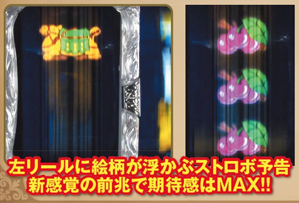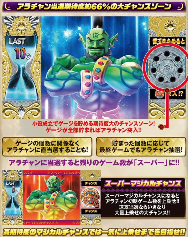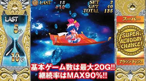 冠名から湧きあがる「現役最強の出玉力」というイメージは、もはやアラジンシリーズの背負った宿命と言っても良いだろう。 荒ぶる出玉を巻き起こすのは、1Gあたりの純増約2.7枚のAT「アラジンチャンス」。1セットの継続ゲーム数は50G+αとなっており、お馴染みの高確率状態に移行すれば、アラチャンの連チャンが見込める。 また、さらなる出玉増加要素として10G以上継続の「スーパーアラジンチャンス」を搭載! |