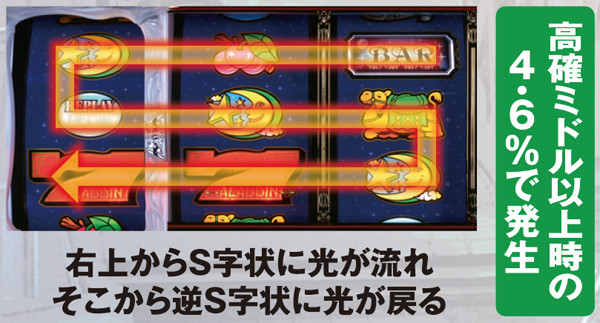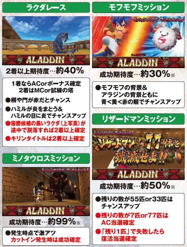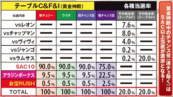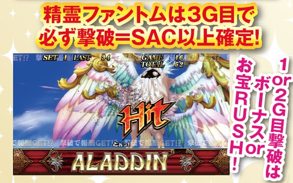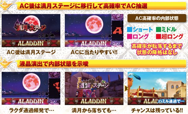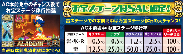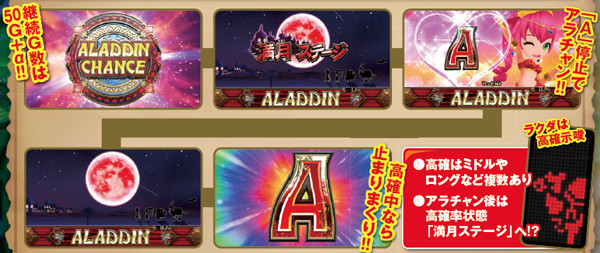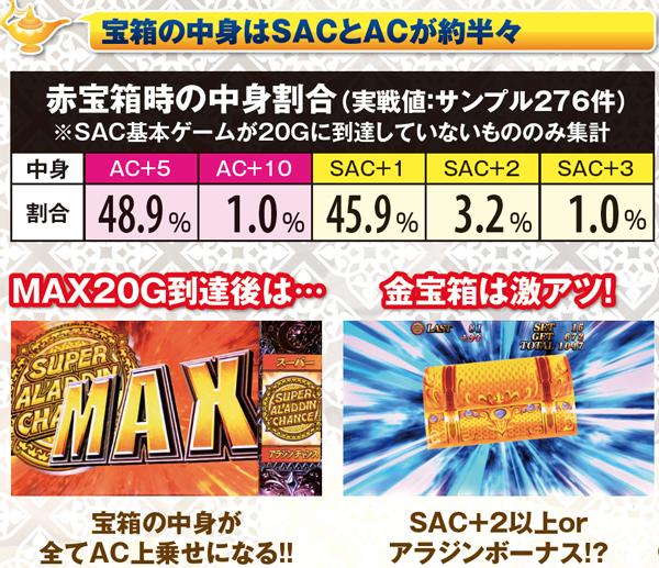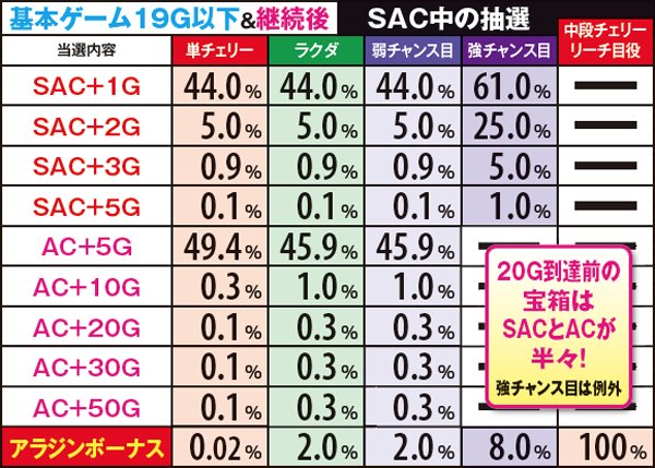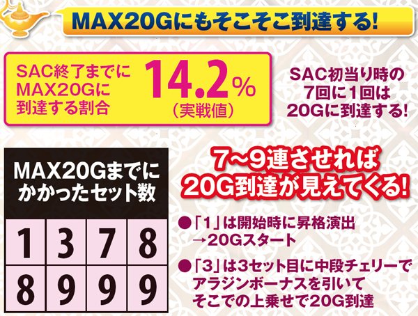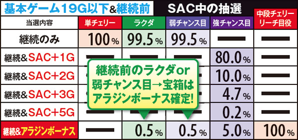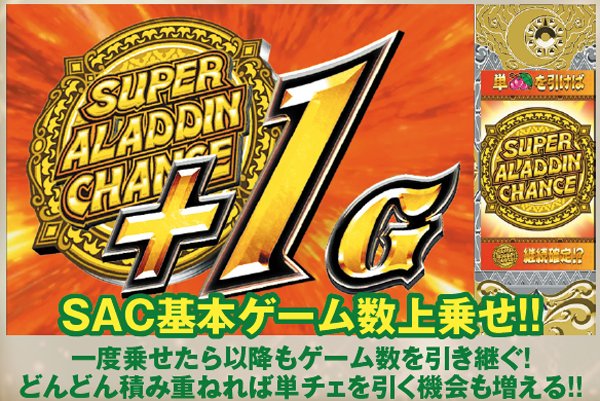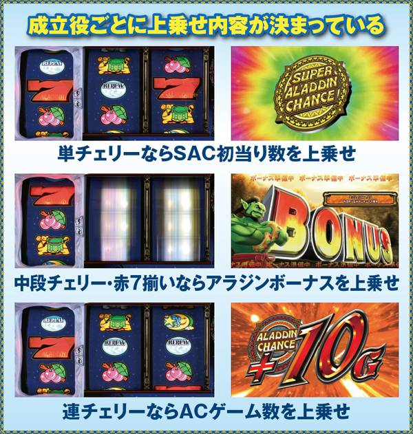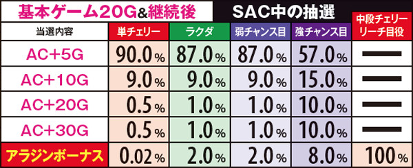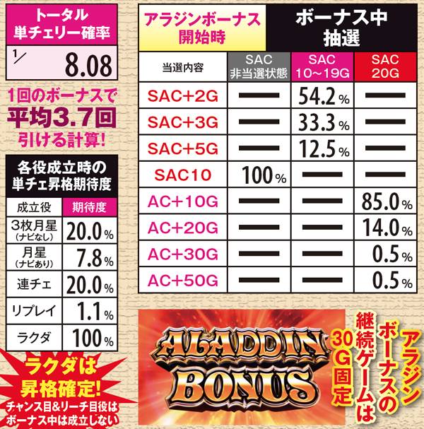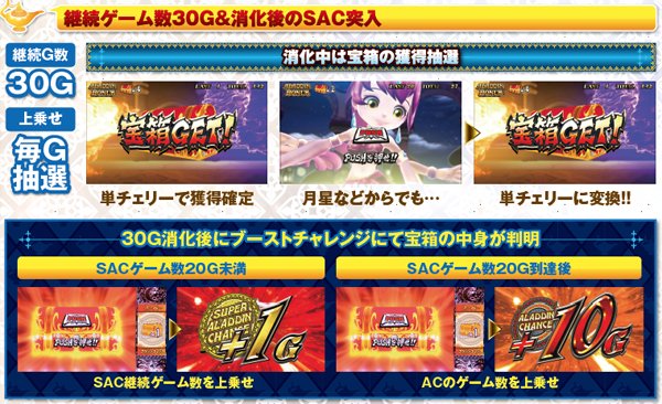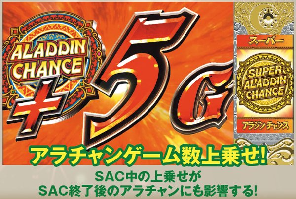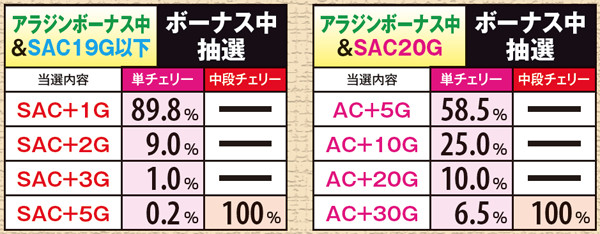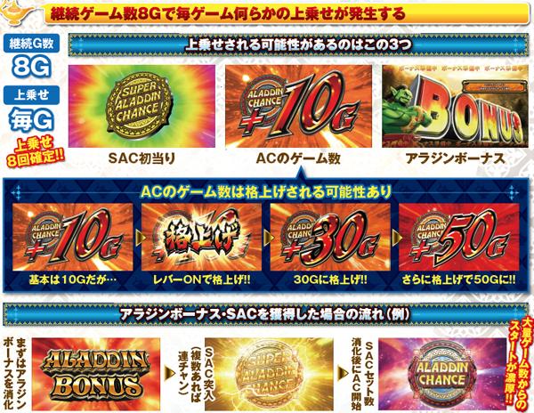 アラジンボーナス開始時は、SAC非当選状態ならSAC初当り当選確定。SAC中のボーナスは基本ゲーム数が19G以下ならSAC上乗せが、20GならACの上乗せ抽選が行われる。ボーナス中は単チェリー出現率が8.08分の1にまでアップしているため、SACorAC大量上乗せのチャンス。