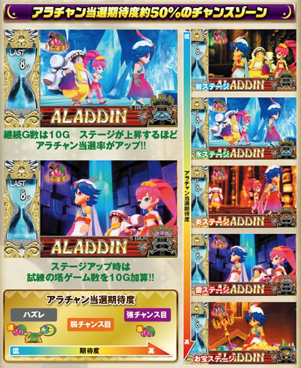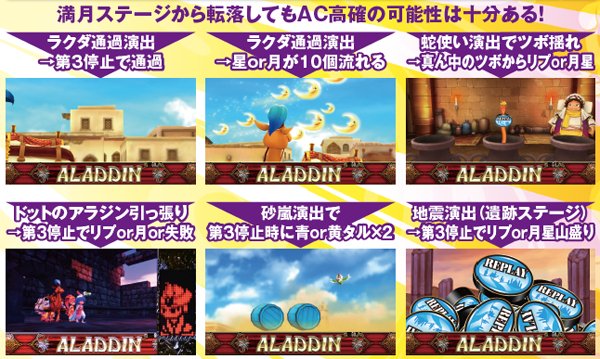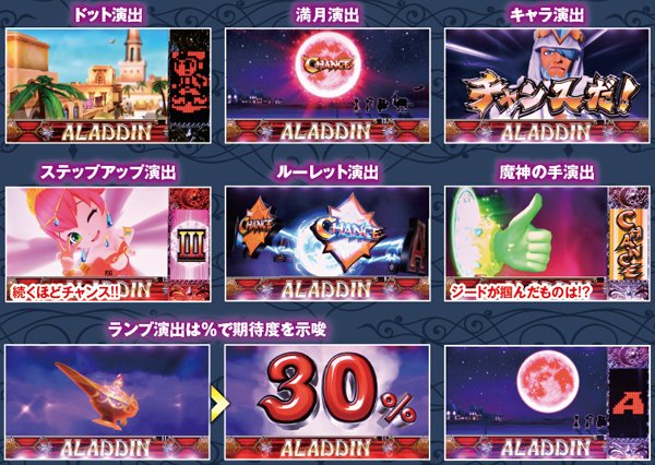 前作ファンなら涙を流さずにはいられないであろうドット演出はもちろん健在。高確滞在示唆の役割を果たしたラクダ通過や、手に汗握るアラジンルーレットなど、お馴染みの演出を液晶画面で堪能することができる。また、液晶機ならではの新たな演出も多数存在。