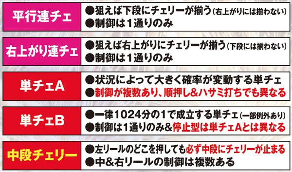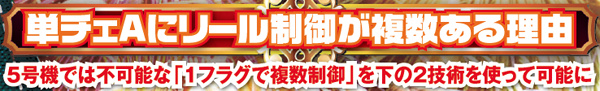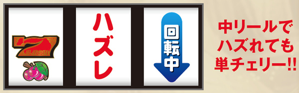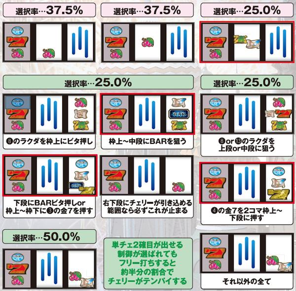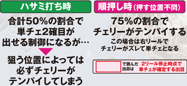順押し時は75%の割合でチェリーテンパイ。25%の割合で単チェ2確目が出現する。ハサミ打ち時は50%の割合で単チェ2確目を出せる制御となるが、狙う位置によっては必ずチェリーがテンパイしてしまうため、2確を出すためには特定位置の目押しが必須となる。出目を最後まで楽しみたいかどうかで狙う位置を変えてみるのも面白いだろう。