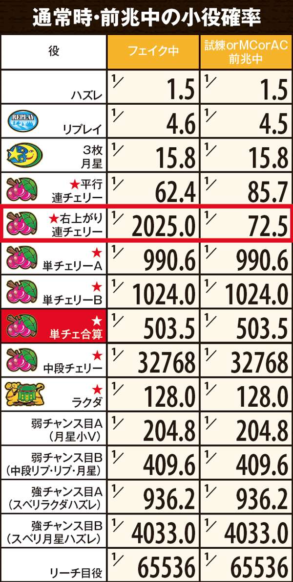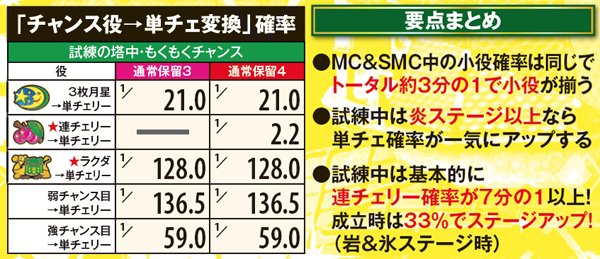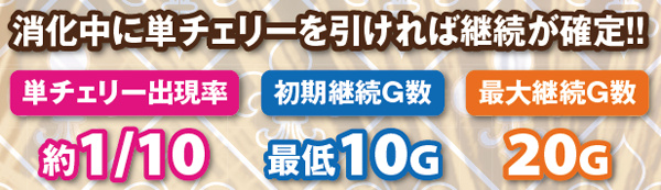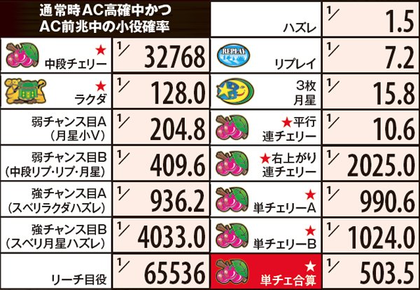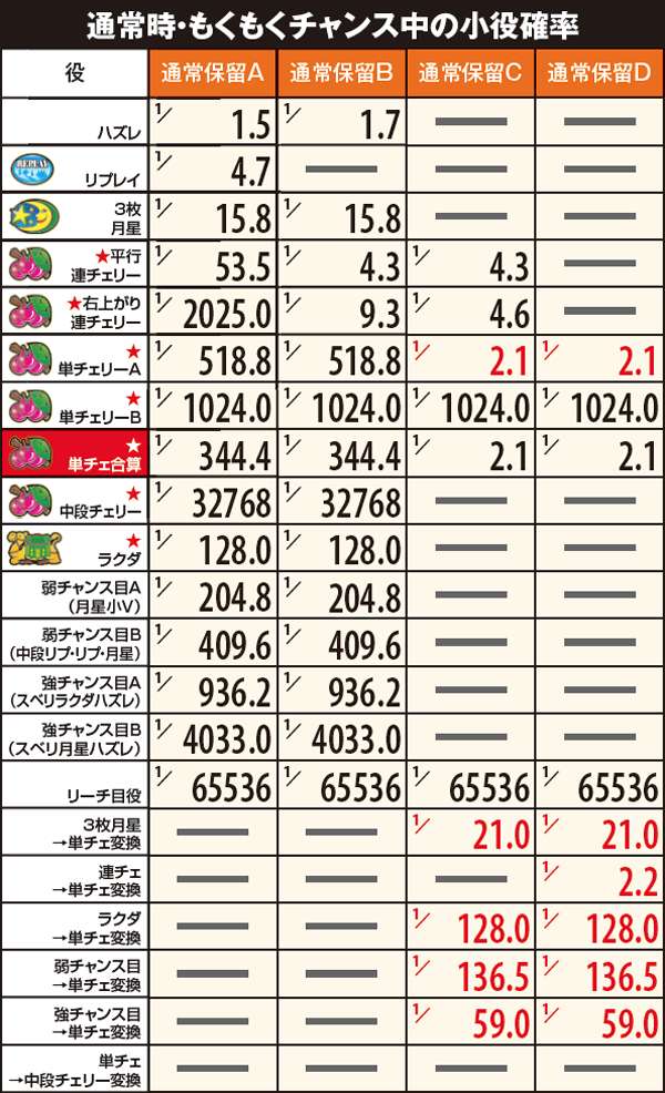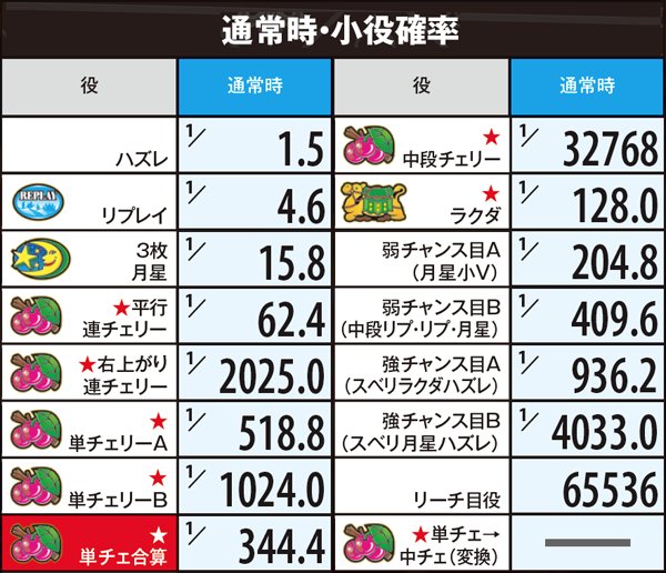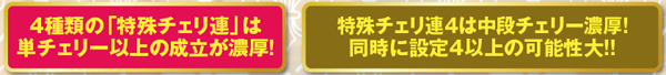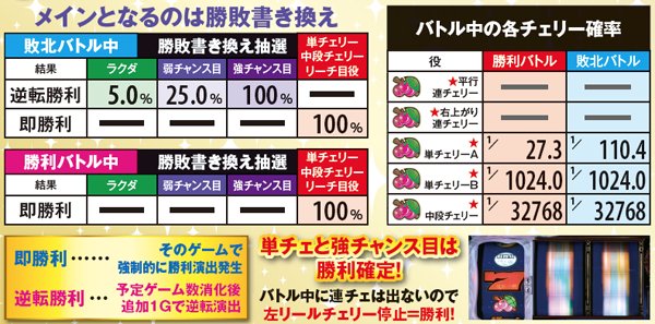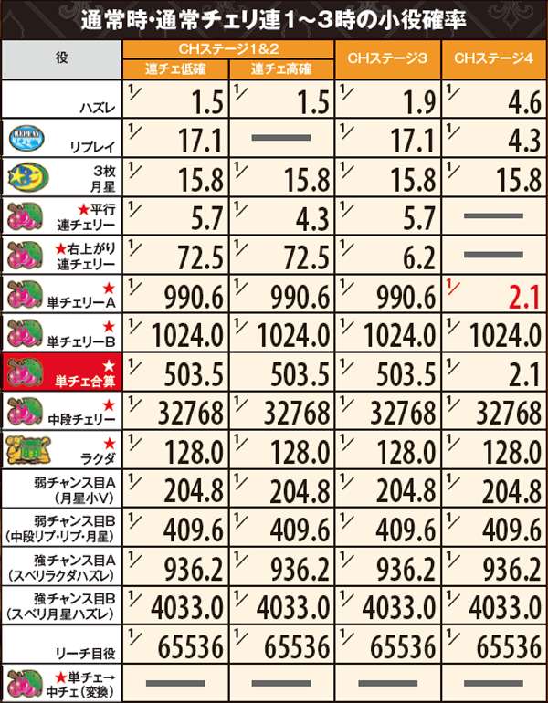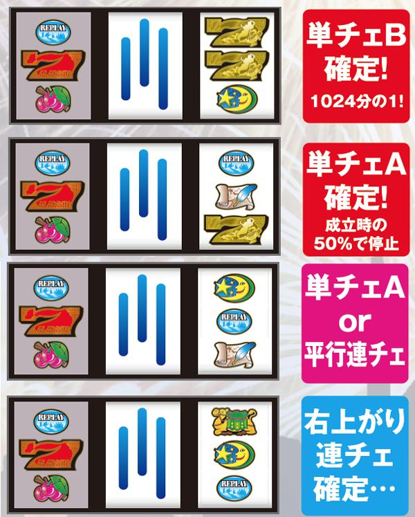 ■連チェ以外のチャンス役は単チェ昇格確定だが抽選自体は昇格前の成立役を参照して行う。それ以外の単チェは全て「単チェリー」として抽選