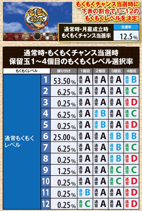 リプレイ&3枚月星入賞時はバックライトに注目。特殊パターンなら高確ミドル以上確定となるのだが、初当りAC後のミドル以上選択率には設定差がある(2連目以降は必ずミドルへ移行する)ため、このタイミングでは特に注目したい。