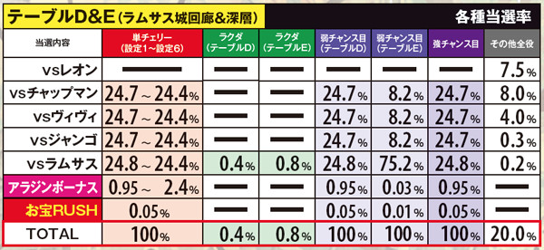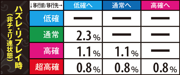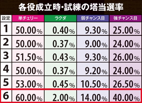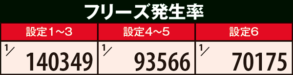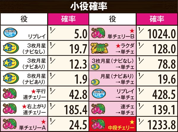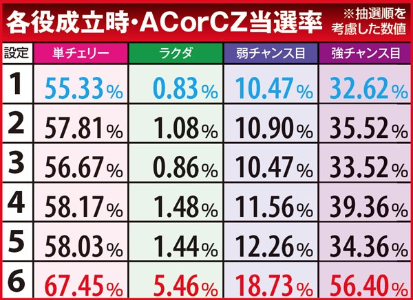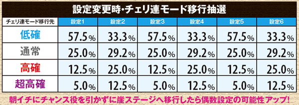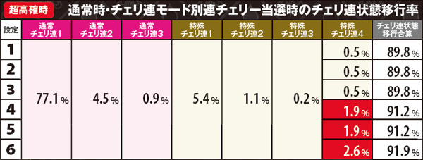 チェリ連状態から中段チェリー停止となる特殊チェリ連4移行率の詳細は上の通り。内部状態を問わず設定1~3なら連チェリー成立時の0.5%、設定4~5なら1.9%、設定6なら2.6%と、1と6で約5倍の開きがある。その他の数値に目をやると、チェリ連状態は基本「通常チェリ連1」に振り分けられることがわかる。