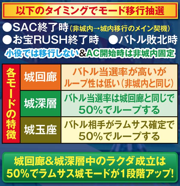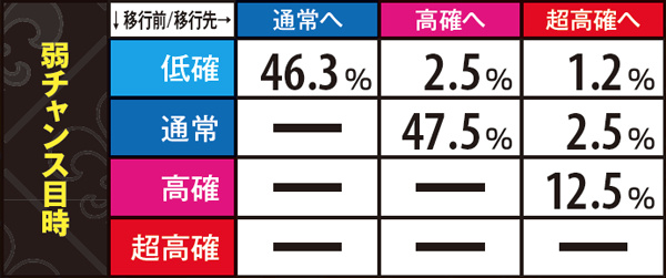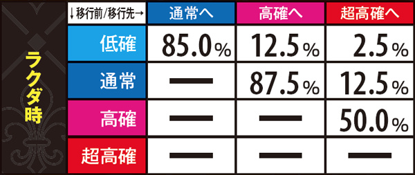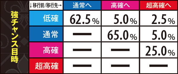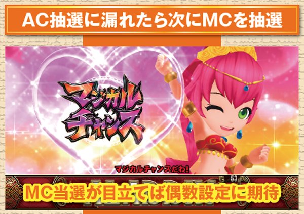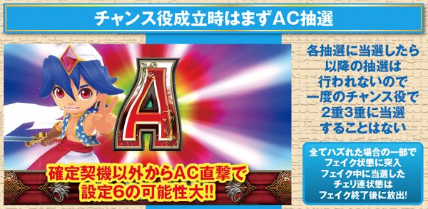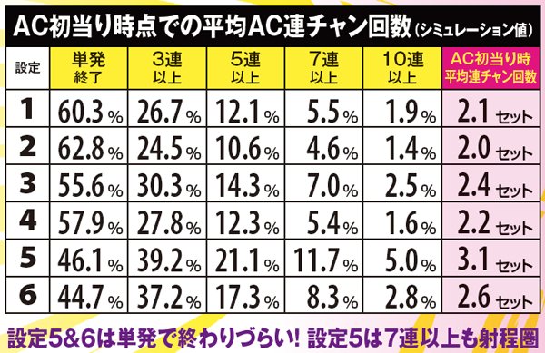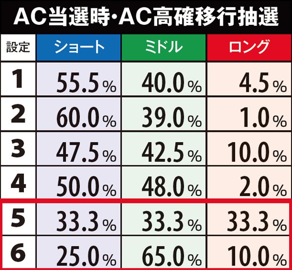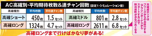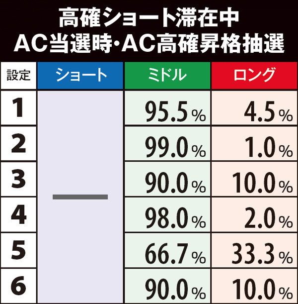 AC高確ショート滞在時はAC当選時にAC高確昇格抽選。必ずミドル以上へ昇格する仕組みで、奇数設定は高確ロングへの移行率が優遇されている。なお、各AC高確の平均連チャン数はショートなら約1.5連、ミドルなら約3連、ロングなら約5連。