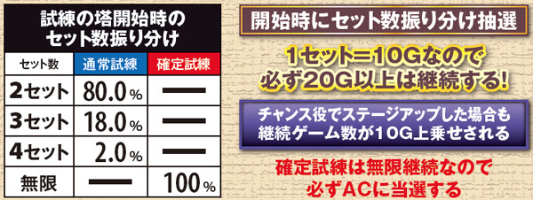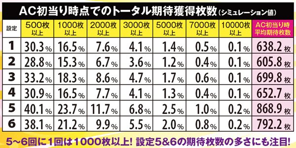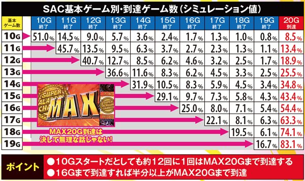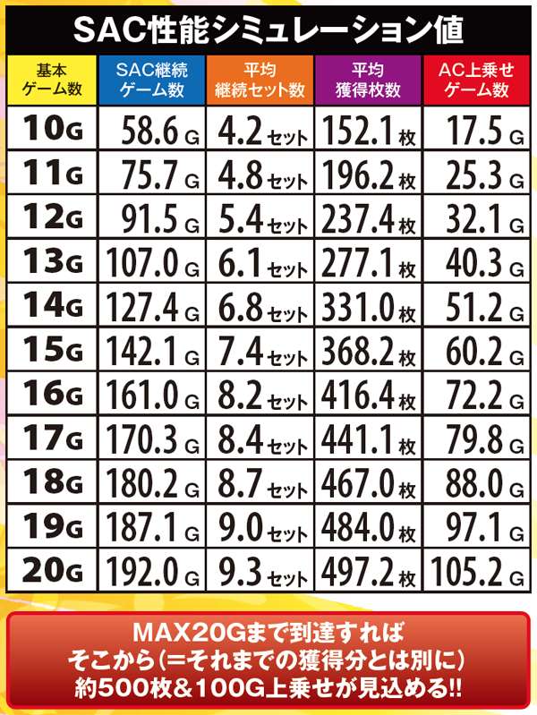 実戦上のSAC平均連チャン数は約5連。ロング継続に繋げられるかどうかは、序盤で如何にSACゲーム数を上乗せできるかに懸かっている。MAX20Gの到達も現実的な割合で起こるため、SAC中はまさに勝負所どころ。上乗せを目指し単チェリーを引きまくりたい。