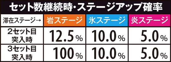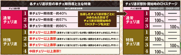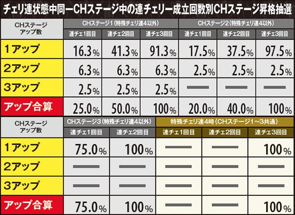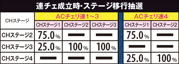 連チェ成立時はCHステージアップ抽選が行われ、同一CHステージ内の連チェ成立回数によってアップ率が変化。大半は1段階アップとなるが、一気に3段階アップする可能性もある。