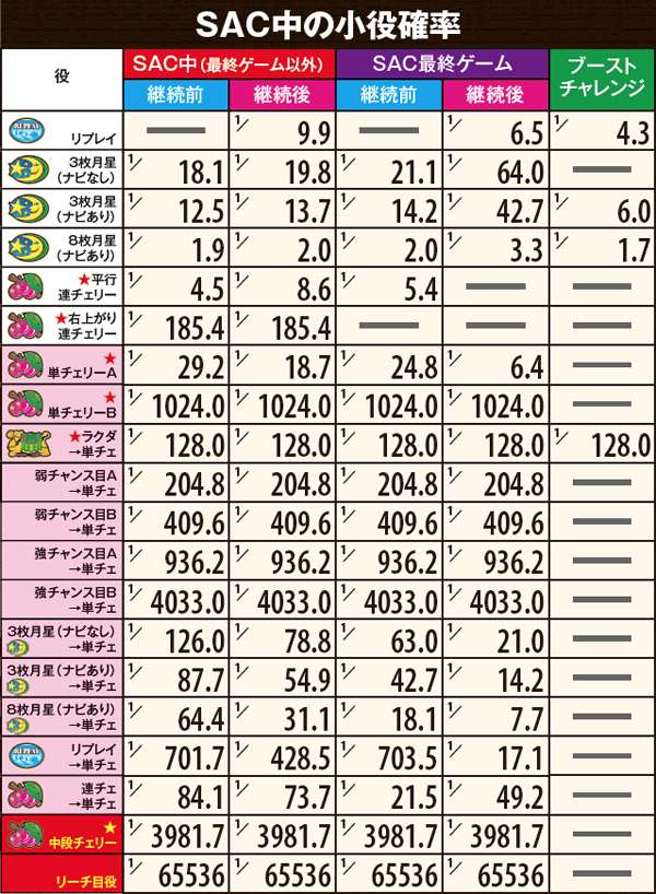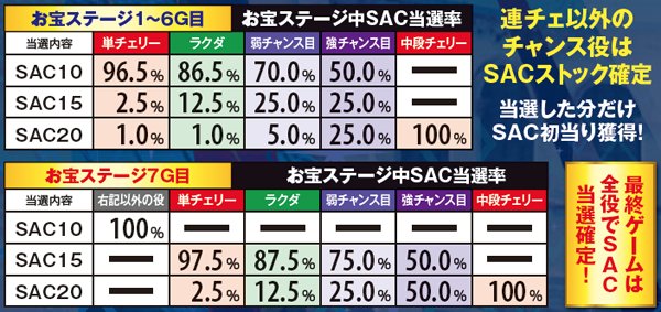 SACは初回最低10Gスタート。消化中は単チェリー確率が約10分の1にアップし、規定ゲーム数内に単チェリーを引けばSAC継続となる。上乗せを重ねて基本ゲーム数を20Gまで増やした際の継続率は驚愕の90%だ。