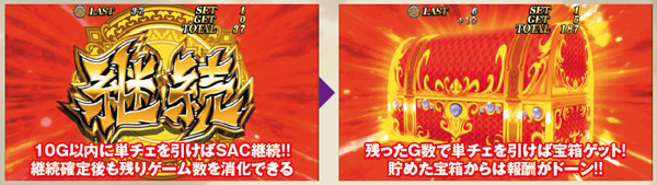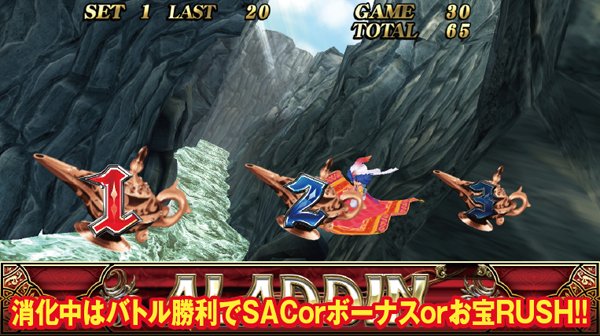 アラジンボーナスは消化後のSACが確定。消化中に宝箱ゲットの抽選が行われ、最後に中身が明かされる仕組みだ。宝箱の色には赤と金があり、後者であればSACの複数ゲーム数乗せに期待できる。
