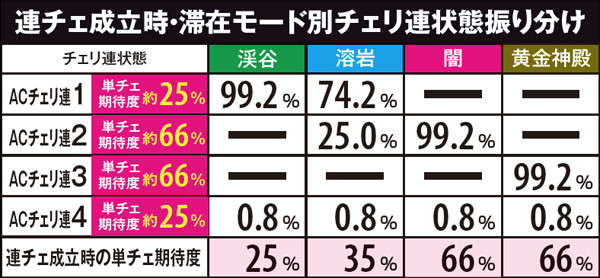 連チェ成立時は4つの滞在モードに従ってチェリ連状態移行率表の割合でチェリ連状態に突入