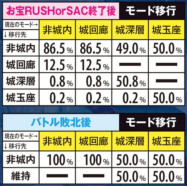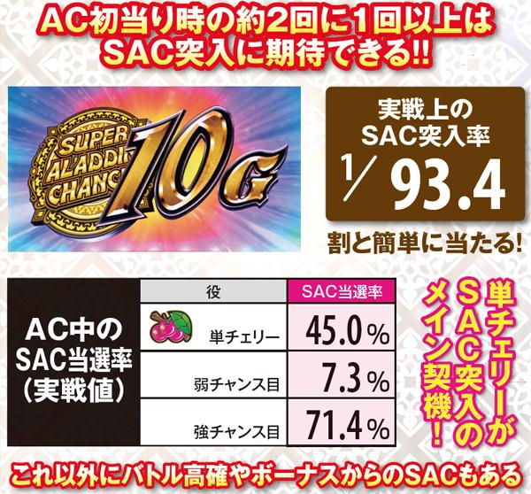 実戦上のSAC当選率は93.4分の1。単チェリーや強チャンス目を引けば半分以上はSAC当選が見込める。SACに入らない限りACをロング継続させることは不可能と言っていいので、AC当選後はSAC突入を目指してレバーを叩くべし。
