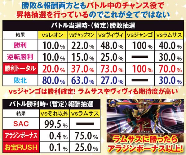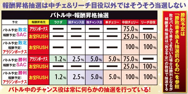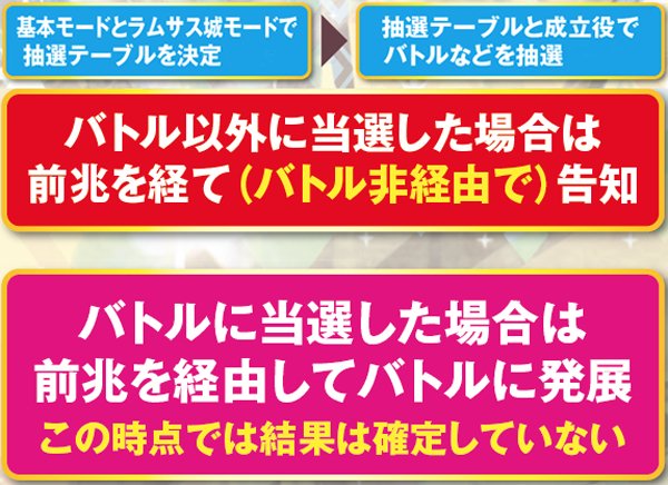 バトル当選時点では対戦相手以外の情報は未決定。バトル開始前に対戦相手に応じた勝敗&報酬&継続ゲーム数を決定する仕組みだ。なお、バトル前兆中も通常のAC中と同様の抽選を行っており(ファントム抽選のみ行わない)、ここでバトルに複数当選した場合は順次バトルが放出される。