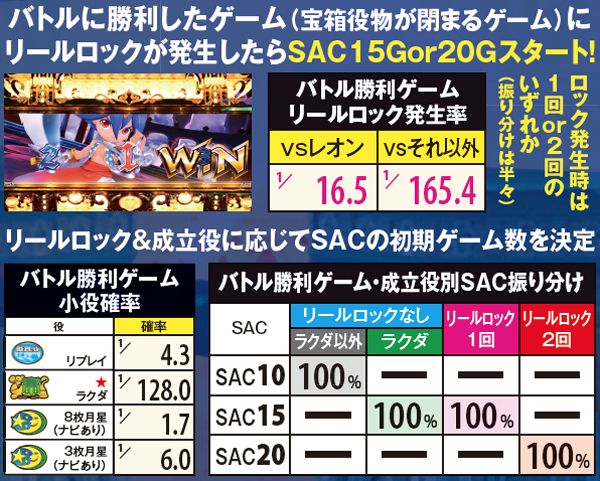バトル勝利ゲームでリールロックが発生すればSACの昇格発生。ロック1回ならSAC15Gスタートが、ロック2回ならSAC20Gスタートが確定する。レオンに勝利ならリールロック発生期待度大幅アップだ。