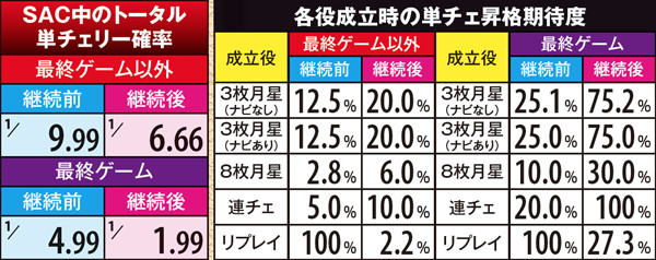 継続確定後の残りSACゲーム数では、単チェリー成立時に「SAC基本ゲーム数・ACゲーム数・ボーナス」の上乗せ抽選。SAC基本ゲーム数を上乗せしまくれば、SAC継続抽選だけでなく、様々な上乗せ抽選において優遇される。まさに上乗せが上乗せを呼ぶ荒波仕様と言えよう。