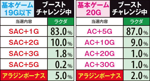 基本ゲーム数を問わず、継続前は基本的に継続抽選のみが行われ、継続確定後は基本ゲームが19G以下ならACorSAC上乗せが半々の割合で、基本ゲーム数が20GならACの上乗せ抽選のみが行われる。また、ブーストチャレンジ時はラクダ成立で上乗せ確定となる。