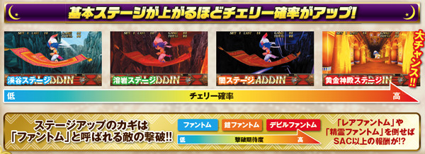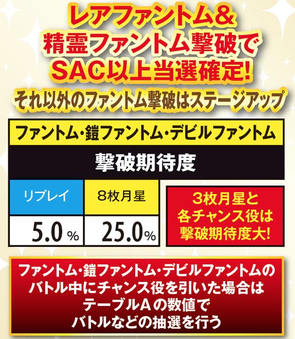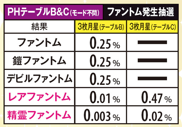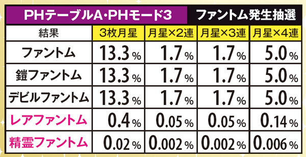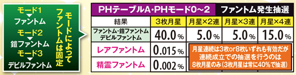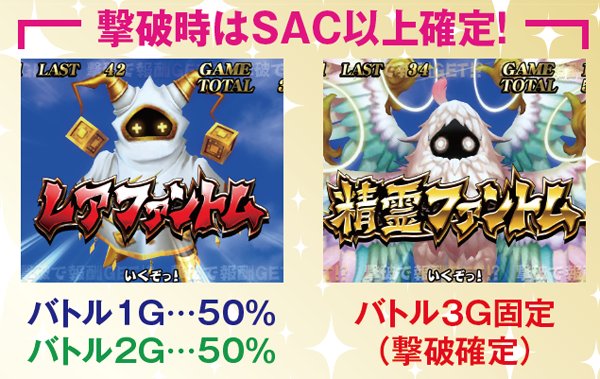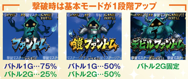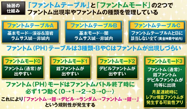 ファントムは、基本的にファントム→鎧→デビル→ランダムの順番で出現。闇ステージや、ラムサス城内では出現率が大幅にダウンする。また、レアファントムは倒せばSAC以上確定。PHモード3(ランダムのターン)だと出現しやすい傾向にある。なお、出現率は低いものの精霊は出現した時点で勝利確定。2G以内に撃破できればボーナス以上が確定する。