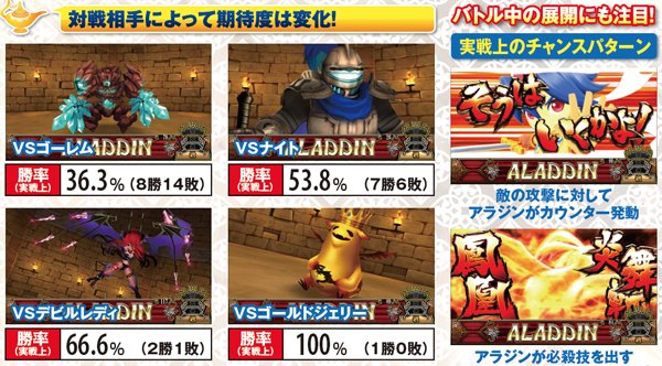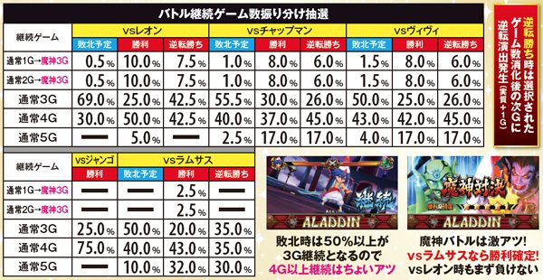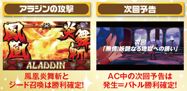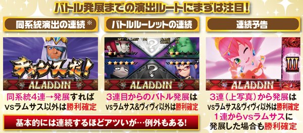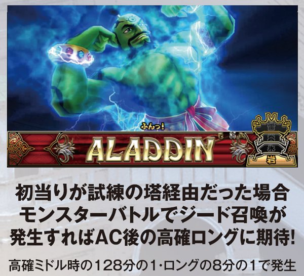 バトル中のジード召喚は基本的に単チェリー入賞ゲームのリール停止時で発生。魔神バトルもジードを召喚するが、その場合は勝利確定ではないので注意しよう。また、レバーON時にアラジンがアップになると、そのゲームでの敗北を否定(敵攻撃の可能性はある)。4G目にアップ発生なら激アツだ。