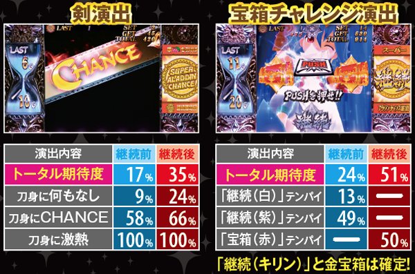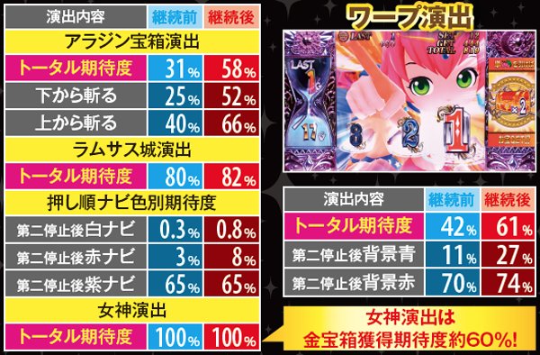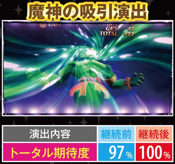 単チェリー出現率がアップする継続確定後は演出期待度も軒並みアップ。継続確定前は、強めの演出発生に期待したい。魔神の吸引演出は単チェリー濃厚、女神演出発生で金宝箱獲得の大チャンスだ。