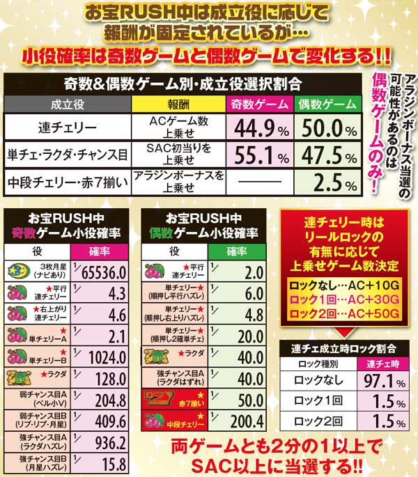 お宝RUSH中の小役出現率は奇数ゲームと偶数ゲームで変化。報酬は成立役に応じて固定となっており、連チェリーならACゲーム数の上乗せが、単チェリー・ラクダ・チャンス目ならSAC初当りが、中段チェリー・赤7揃いならボーナスが上乗せされる。偶数ゲームはボーナス当選のチャンスだ。