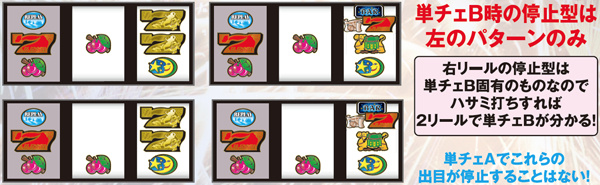 単チェリーBの停止型は上のパターンのみとなっており、右リールの停止型が特徴的。ハサミ打ちなら2リールで成立を察知できる。なお、中リールの停止型は押し位置によって変化。基本的には下段にチェリーが止まりやすい。