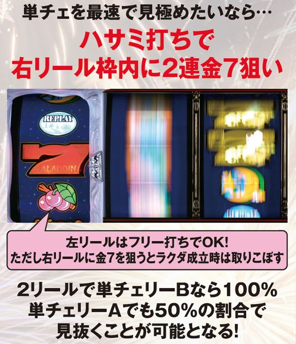 ハサミ打ち&右枠内金7狙いが単チェ見極めの最速手順。ちなみに若干目押しが早くてもほぼ傾向は変わらない(右上段に③番の金7停止で右上がり連チェ確定が加わるのみ)。逆に最後まで期待感を引っ張りたいのなら、ハサミ打ちで右赤7狙い(単チェB以外は必ずチェリーテンパイする)がオススメだ。