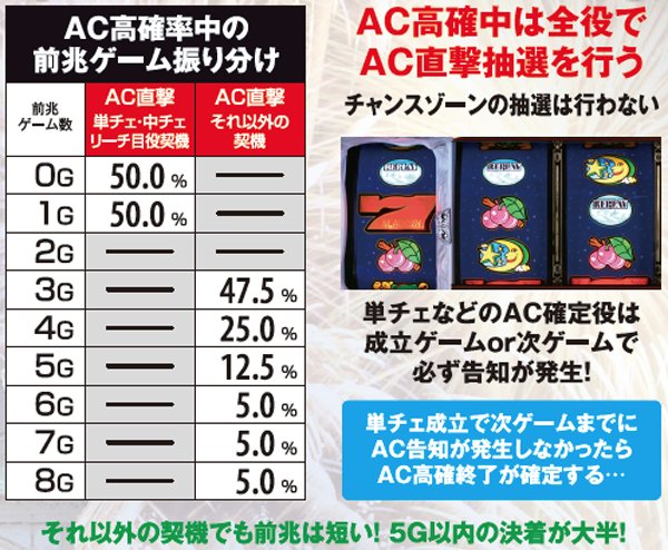 AC終了後は必ずAC高確に移行。AC高確中は成立役を問わず高確率でAC抽選が行われているため、ACの速攻連チャンに期待できる。なお、AC高確は「ショート・ミドル・ロング・超ロング」の4種類。高確終了まで状態の格下げは行われないため、後者になるほどロング継続の期待大となる。