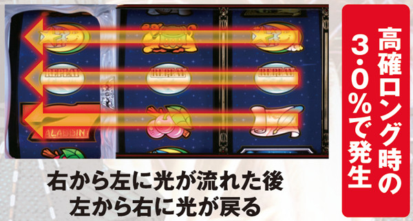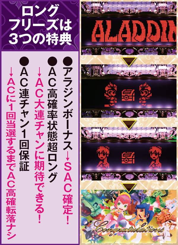 レバーONで液晶がブラックアウトすれば歓喜のロングフリーズのサイン。その瞬間に、アラジンボーナス+AC高確状態超ロングへの移行+AC連チャン1回保証が確定する。当選率はかなり低いと思われるが、一度は引きたい大量出玉必至のプレミアム要素と言えよう。