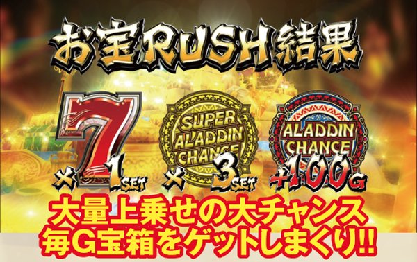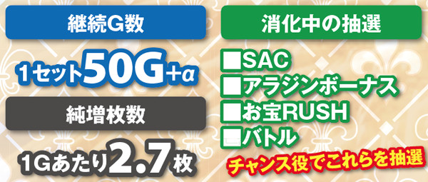 お宝RUSHは、8G継続の宝箱獲得特化ゾーン。消化中は毎ゲーム「ACゲーム数・SAC・アラジンボーナス」の上乗せが行われるため、その後の大量出玉は必至となる。突入率は低そうだが、突入時の恩恵は大きそうだ。